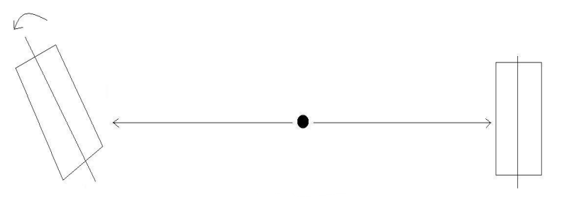 في البداية سنضع المقطبين بشكل متوازي مع كل من الفوتونين المنطلقين، كما هو موضح بالشكل (4–6). يوجد راصدان عند كل من المقطب (A) و(B)، حتى يخبرانا بحالة استقطاب كل من الفوتونين المنطلقين بشكل متعاكس. في هذه الحالة ستكون نتائج كلا الراصدين متطابقة تماما. هذا متوقع لأنه إذا كانت حالة استقطاب الفوتون المتجه إلى المقطب (A) عمودية، أي موازية لاتجاه المقطب فأن الفوتون سوف يعبر بهذا نكون قد علمنا عن حالة استقطاب الفوتون الذاهب إلى (B) قبل أن يقيسه الراصد الموجود هناك حتى الآن يسير كل شيء بشكل جيد. نقوم الآن باستدارة المقطب (B) بزاوية 45º مع محور المقطب (A)، كما هو موضح بالشكل (5–6).