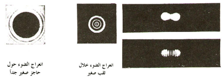 نرى في الصورة العلوية بقعتين مضيئتين ناجمتين عن شعاعين يعبران أحد الثقبين الواحد بعد الآخر (كل ثقب مفتوح وحده بدوره، والآخر مغلق) وعلى الصورة السفلية نرى عصابات ناجمة عن مرور الضوء من كلا الثقبين في آن واحد 84.