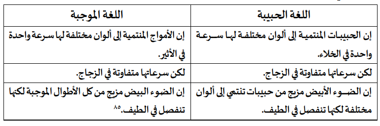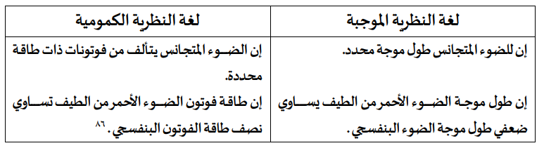 وفيما يلي نستعرض جدولاً مقارناً بين النظرية الجسيمية والموجية للضوء: