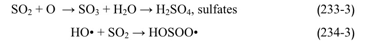 يمكن لعدة مركبات كيميائية مؤكسدة في الضباب الدخاني أن تؤكسد SO2، والتي تتضمن O3، وNO3، وN2O5، بالإضافة إلى الجذور الفعالة وخصوصاً •HO، و•HOO، و ، و •RO، و •ROO. إن التفاعلين الرئيسيين البدئيين هما تفاعل نقل الأوكسجين أو إضافة •HO: