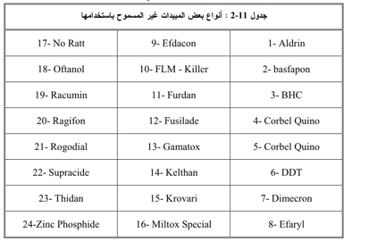 كمبيدات مكافحة الجراد الصحراوي والتي بقيت بعض الكميات منها دون استخدام، وذلك نظراً لانحسار حالة الجراد الصحراوي في المنطقة العربية إضافة إلى وجود أنواع أخرى من المبيدات المختلفة دخلت البلاد عبر مشاريع ثنائية أو مساعدات أو عينات للتجارب مما جعلها مصدراً ملوثاً نتيجة لمرور فترة زمنية طويلة دون أن تستخدم أو تعدم مما أدى لتحلل البراميل التي تحتويها بفعل موادها الكيميائية، وتكمن خطورتها في حال تخزينها في مستودعات غير مراقبة فنياً و وغير ملائمة حيث تعتبر هذه المبيدات أحد مصادر التلوث ، خاصة إذا تسربت إلى التربة بفعل الجاذبية الأرضية مما يخشى أن تصل إلى المخزون الجوفي للمياه وتلوثها.