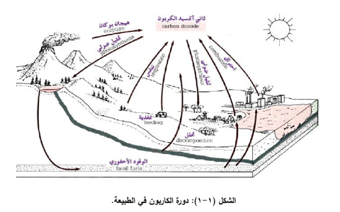 1 - دورة الكاربون في الطبيعة يحتوي الهواء الجوي على (0.03 - 0.04% ) من غاز ثاني أوكسيد الكاربون (CO2) أي حوالي 1530 طن. ويتكون غاز CO2 نتيجة للنشاط الحيوي للنبات والحيوان والإنسان (الشكل 1-1 )
