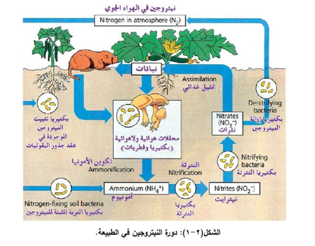 2- دورة النيتروجين (دورة الآزوت): يدخل النيتروجين في تركيب الأحماض الأمينية وبالتالي في البروتينات وتدخل الأحماض الأمينية والبروتينات في تركيب جسم الإنسان عن طريق التغذية الحيوانية والنباتية والتي تتحول في جسم الإنسان إلى بروتينات خاصة به وينتج النيتروجين عن هدم البروتينات في الجسم لتكوين مواد نيتروجينية بسيطة مثل اليوريا وحامض اليوريك والأمونيا التي تفرز على شكل بول أو براز. وتتحلل بقايا النباتات والحيوانات الميتة على الإفرازات بفضل الكائنات الحية الدقيقة سواء أكانت هوائية أو لا هوائية( الشكل 2-1) . ونتيجة لعملية التحلل تحدث عملية النشدرة (تكوين الأمونيا NH3) التي تستهلك جزءاً منه بوساطة النبات والباقي يتحول بفعل البكتريا إلى نتريت ونترات في عملية التأزت. ويمكن أن تتعرض هذه النواتج جزئياً إلى عملية عكس التأزت التي تقوم بإحداثها بعض أنواع الكائنات الدقيقة وينتج عنها النيتروجين الحر الذي يفقد من التربة إلى الجو. ويوجد النيتروجين في الجو أكثر من أي مكان آخر. فالنيتروجين الحر يكون الجزء الرئيسي للهواء الجوي ( تقريباً 78% منه حجماً).