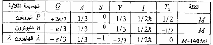 جميع الأعداد الكمية والخواص الأساسية لجسيمات الكوارك موضحة بالجدول (1–3) أما الأعداد الكمية للكوارك المضاد فهي نفسها مع عكس الإشارات.