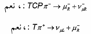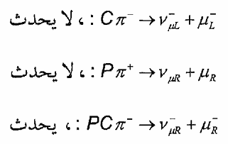 إن الرمز التحتي L يدل على أن النيوترينيو والميون الموجب ينطلقان ببرم أيسر (يساري). ونحن نعلم أن تأثير C في هذه العملية هو مبادلة الجسيمات بضديداتها، بينما ينحصر تأثير P في تحويل الحركة اليسرى إلى حركة يمني (الرمز التحتي R يشير إلى ذلك). ولذلك نحصل على العمليات المحولة الآتية: