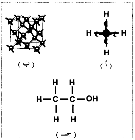 الشكل (7 – 1) ترتبط ذرة الكربون بذرات الكربون المماثلة لها أو بذرات مواد أخرى عن طريق الرابطة التساهمية لتكوين ملايين من المركبات مثل (أ) غاز الميثان، (ب) الماس (ج) الكحول الإيثيلي (1).