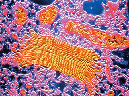 A transmission electron micrograph of a Golgi apparatus, a membranous subcellular structure.