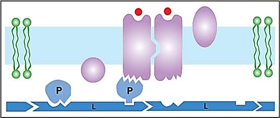 There are two general ways this transfer of information occurs. First, in many cases, the binding of the external stimulus molecule to the receptor brings about a specific change in the shape of this protein. The altered form of the receptor is then recognized by a relay protein inside the cell because its new shape precisely matches a site on the relay protein, enabling them to fit together like a key in a lock. This association turns on the response. The second class of receptors uses a somewhat different strategy: the binding of extracellular signal molecules to these membrane molecules causes them to change shape, but, in this case, their altered contour allows them to associate with one another (once again, through lock-and-key recognition). These conglomerates are then recognized as a stimulus by the appropriate relay proteins at the cytoplasmic side of the membrane.