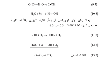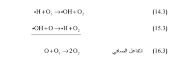 يمكن أيضاً لجذر الهدروجين (المتكون وفقاً للتفاعل 10.3) المشاركة في إلغاء دورة الأوزون بتفاعله مع الأوزون لتكوين جذر هدروكسيل وأكسجين جزيئي. وتكون النتيجة النهائية حينئذ مماثلة لنتيجة التفاعل 9.3 حيث يُسهم جزيء واحد من الماء في تكوين جذري هدروكسيل يشتركان بعدئذ في دورة تدمير الأوزون. وعلى غرار الجذور الأخرى، يمكن لجذر الهدروجين أيضاً أن يظهر في دورة محفّزة لتدمير الأوزون: