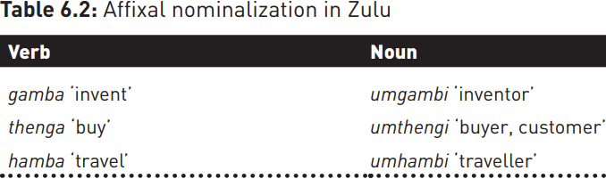 Prefixes in English, unlike suffixes, almost never change word class: there are a few, generally unproductive, exceptions such as a- which derives the adjectives ablaze, awash and abuzz from the nouns blaze, wash and buzz, and the verbal prefix en- in enrage, enamour, entangle. Not all languages restrict the functions of prefixes in this way. In Zulu, for example, the prefix um-, coupled with a change of final vowel, is used to derive nouns from verbs: