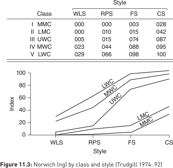 Aside from the clear pattern of stratification across the five social classes Trudgill identified in Norwich (lower, middle and upper working class; lower and middle middle class), two points are noteworthy from this graph: