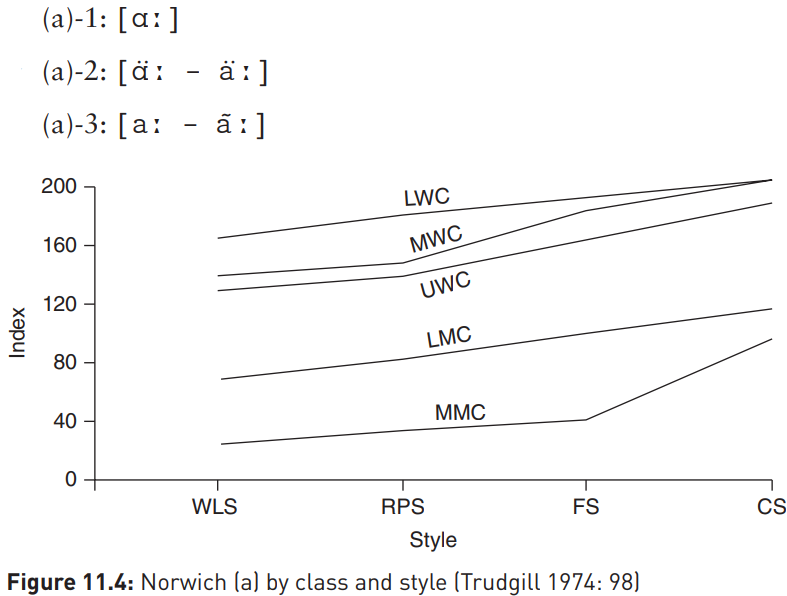 As we can see from Figure 11.4, the variable (a) shows the familiar pattern of social stratification but the slopes are much flatter, because there is little difference between formal and informal styles. This suggests that, although the Norwich speech community agrees on what the ‘correct’ form is (the lines again all slope in the same direction), they do not perceive the variation to be socially significant in this case.