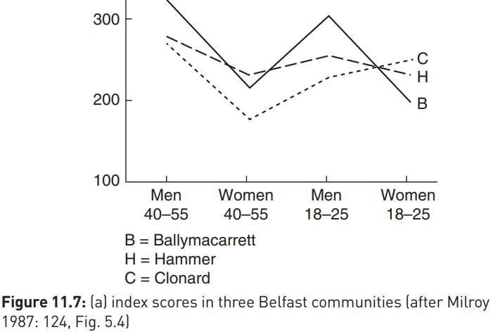 In her seminal Belfast study, Lesley Milroy examined the use of the (a) variable, for which a wide range of local vernacular variants had been identified, in three Belfast communities: Ballymacarrett, the Hammer and the Clonard. As the graph above shows, in two of these communities the pattern was as expected for both younger and older speakers, but in the Clonard younger women had higher vernacular scores for this variable than younger men. Milroy explains this unexpected pattern in terms of changing social network structures. Significantly, the Clonard had been affected by unemployment in a different way from the other communities: here, younger women were more likely to be in stable employment than men. The workplace, which requires people to conform and show solidarity, acts as a powerful linguistic norm enforcement mechanism, to which men have traditionally been subjected to a greater degree than women.