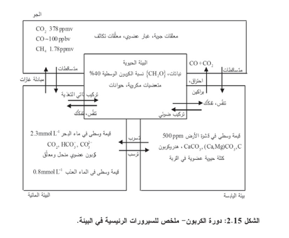 تُعدُّ دورة الكربون (الشكل (2.15 ) واحدة من الدورات الكبرى التي تحدد أشكال الحياة والتأثيرات المتبادلة فيما بينها ضمن البيئة الأرضية. فأنواع الكربون العضوية واللاعضوية الهامة توجد في الماء والجو وعلى اليابسة. وجميع المركبات العضوية وأنواع الكربونات اللاعضوية تنضوي ضمن هذا المشهد العام بطريقة أو بأخرى، من خلال التركيب والتحول و/أو التفكك.