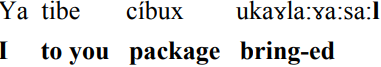 Languages like this are not just random mixing on the spur of the moment. Mednyj Aleut has rules. Certain verb endings, such as the one in the sentence that follows, are from Russian, as are certain pronouns. Case endings on nouns as well as nouns and verbs themselves are usually from Aleut.
