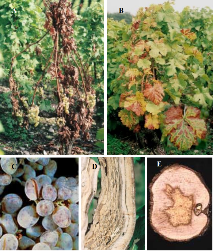 أعراض الإصابة بمرض الموت التراجعي المتسبب عن الفطر A) .Eutypa lata) ظهور الطرود متقزمة، وذات أوراق صغيرة وشاحبة على جزء من دالية الكرمة بينما يبدو الجزء الآخر سليماً. كما يلاحظ التقرح على جذع الدالية حول مكان تقليم قديم (مشار إليه بسهم). (B) منطقة متقرحة تحت مكان تقليم قديم. (C) مقطع عرضي في الجذع يظهر منطقة تلون بالبني على شكل حرف D) .V) إنتاج غزير من الصمغ حول منطقة التقرح على جذع شجرة كرز مصابة بالمرض.