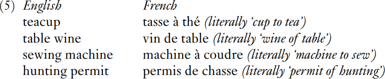 It is not that French lacks compounds: for example, rouge-gorge ‘robin’ (literally ‘red-throat’), gratte-ciel ‘skyscraper’ (literally ‘scrape-sky’), and essuie-glace ‘windscreen-wiper’ (literally ‘wipe-screen’). But it is notable that these compounds are all exocentric (a robin is not a kind of throat, and a skyscraper is certainly not a kind of sky). In French, endocentric nominal compounds are relatively scarce by comparison with English; in their place, French makes greater use of phrasal idioms.