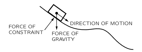 In motion with a fixed frictionless constraint, no work is done by the constraint because the forces of constraint are always at right angles to the motion. By the “forces of constraint” we mean those forces which are applied to the object directly by the constraint itself—the contact force with the track, or the tension in the string.