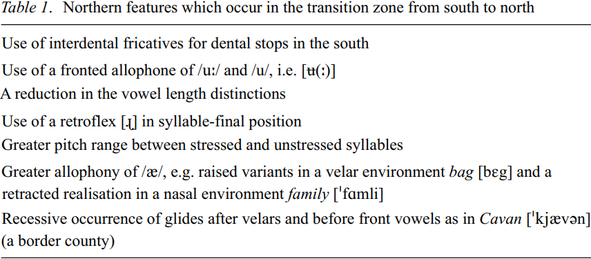The north of the country is quite distinct from the south, accents of northerners being immediately recognizable to southerners. A dividing line can be drawn roughly between Sligo, just south of Co. Donegal, and Dundalk on the east coast immediately below the border with Northern Ireland (Ó Baoill 1991). North of this line the accents are distinctly Ulster-like. South of this line the northern features rapidly give way to southern values. The term line here might imply a clearly delimited boundary, perhaps zone might be more accurate, as border counties such as Monaghan, Cavan or Louth show mixed accents which have adopted features from both northern and southern types.