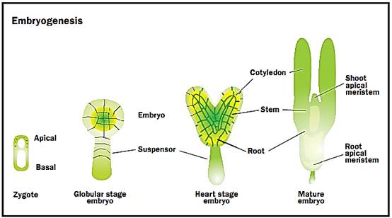Embryo formation begins with cell division that establishes the apical- basal (top-bottom) axis. Further divisions elaborate on this basic plan, finally forming the cotyledons (seed leaves), as well as the apical meristems of root and shoot.