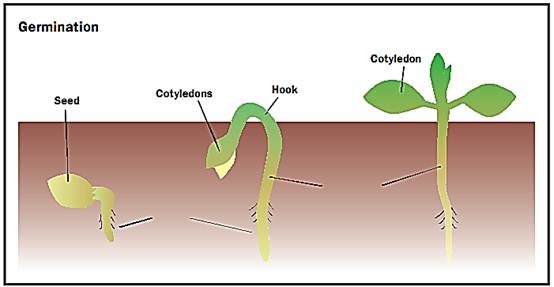The root is the first portion of the plant to emerge during germination. Growth of the stem behind the cotyledons forms a “hook” that emerges from the soil, followed by emergence of the cotyledons, which begin to photosynthesize to feed further growth.