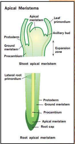 Apical meristems are involved in several distinct developmental processes. The meristems are the location of cell proliferation and thus the source of all new cells in the shoot and root systems. The regions below the meristems are the sites of active growth, as new shoot and root tissue rapidly expands. The shoot apical meristem plays a role in organogenesis, the formation of new leaves and axillary buds in a precise spatial pattern. In contrast, the root apical meristem is not involved in organogenesis; lateral roots are initiated by pericycle cells, which are themselves derived from the meristem, usually several centimeters away from the meristem. The apical meristems also play a role in histogenesis by giving rise to cells that undergo distinct patterns of differentiation to form the specialized tissue types of the shoot and root. While the embryo initially gives rise to the precursors of dermal, ground, and vascular tissues (protoderm, ground meristem, and procambium, respectively), these tissue precursors continue to be formed by the apical meristems and represent the first stages of cell and tissue differentiation.