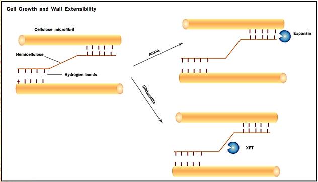 The plant hormones auxin and gibberellin are produced in the vicinity of the apical meristems and usually act in concert to induce cell growth. Both hormones regulate wall extensibility, but carry out this function in different ways. Auxin induces the activity of cell membrane H+ adenosine triphosphatase (ATPase) molecules. Proton (H+) extrusion lowers the pH of the cell wall, thus activating the cell wall enzyme expansin. Expansin cleaves the hydrogen bonds between two cell wall components: The cellulose microfibrils and the hemicellulose molecules that link adjacent cellulose microfibrils. Breakage of these bonds allows these structural wall components to reposition themselves farther apart, increasing wall extensibility. Gibberellic acid, on the other hand, stimulates the activity of another cell wall enzyme called xyloglucan endotransglycosylase (XET). Xyloglucans are a type of hemicellulose that is cleaved by the XET enzyme. Breakage of the hemicellulose molecules also allows the cellulose microfibrils to move farther apart, increasing wall extensibility.