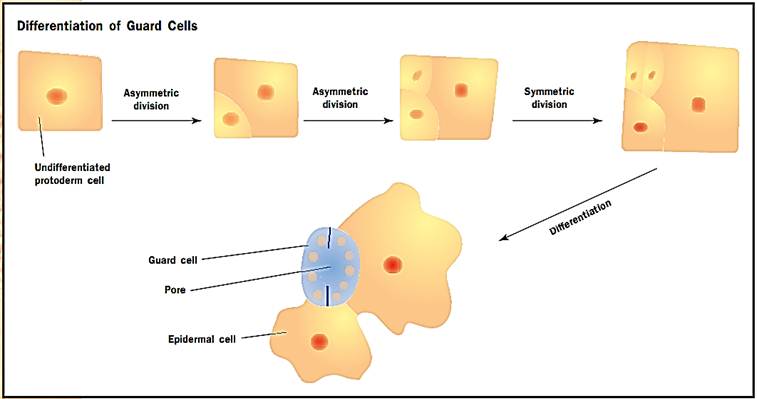The process of differentiation is best understood on a cellular level. For instance, guard cells are highly specialized epidermal cells. Early in the development of a leaf, protodermal precursor cells undergo a distinctive pattern of cell divisions. At first the cell divisions are asymmetric, producing one large and one small derivative. The large derivative stops dividing and differentiates as an unspecialized epidermal cell, while the small derivative undergoes another asymmetric division. At an unknown stop signal, the small derivative undergoes a symmetric division, giving rise to two equal sized cells that become the guard cells. Unlike their plain neighbors, these cells develop a distinctive kidney shape, unevenly thickened cell walls, large, conspicuous chloroplasts, and finally form a pore (the stomatal aperture) between them.