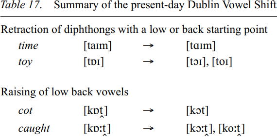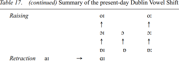 The vowel shift in Dublin English is not just confined to the realization of /ai/. Other vowels in the area of this diphthong are affected, particularly the diphthong in the CHOICE lexical set and the low and mid vowels in the LOT and THOUGHT sets which usually have a lower realization than in Britain (or unrounded in the case of the LOT vowel): boy