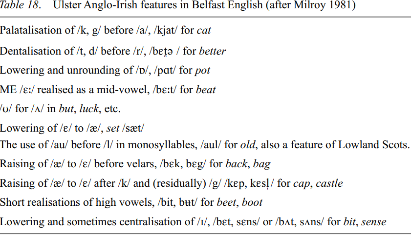 The English spoken in Belfast is an amalgam of features which come from the two main English communities in Ulster with independent traits only found in the capital city. The following is a list of features which can be clearly attributed to one of the two main English-language sources in Ulster (Milroy 1981: 25–26).