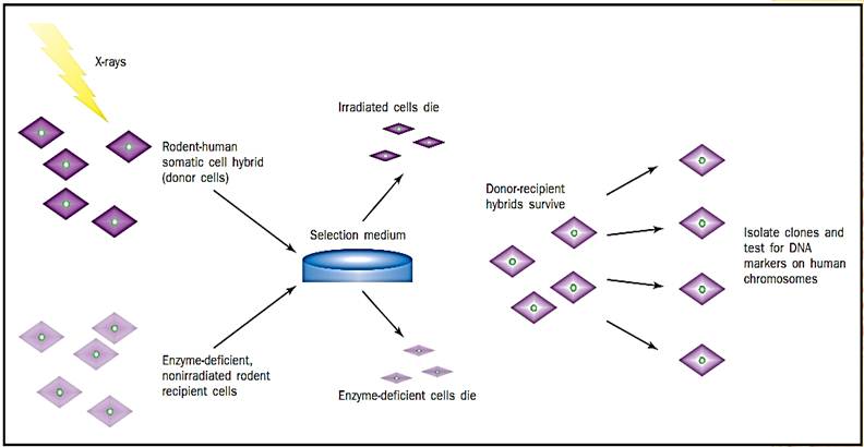 A rodent-human somatic cell hybrid (“artificial” cells with both rodent and human genetic material), which contains a single copy of the human chromosome of interest, is X-irradiated. This breaks the chromosome into several pieces, which are subsequently integrated into the rodent chromosomes. In addition, the dosage of radiation is sufficient to kill the somatic cell hybrid or donor cells, which are then rescued by fusing them with nonirradiated rodent recipient cells. The latter, however, lack an important enzyme and are also killed when grown in a specific medium. Therefore, the only cells that can survive the procedure are donor-recipient hybrids that have acquired a rodent gene for the essential enzyme from the irradiated rodent- human cell line