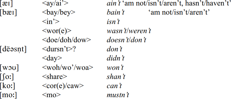 The Black Country is noted for its highly contracted negative modal forms, evidenced where possible using Painter’s (1963: 32–33) transcriptions, as well as respelling conventions, as follows: