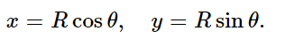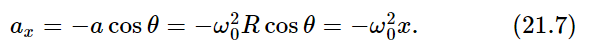 The fact that cosines are involved in the solution of Eq. (21.2) suggests that there might be some relationship to circles. This is artificial, of course, because there is no circle actually involved in the linear motion—it just goes up and down. We may point out that we have, in fact, already solved that differential equation when we were studying the mechanics of circular motion. If a particle moves in a circle with a constant speed v, the radius vector from the center of the circle to the particle turns through an angle whose size is proportional to the time. If we call this angle θ=vt/R (Fig. 21–2) then dθ/dt= ω0= v/R. We know that there is an acceleration a= v2/R= ω20R toward the center. Now we also know that the position x, at a given moment, is the radius of the circle times cos θ, and that y is the radius times sin θ: