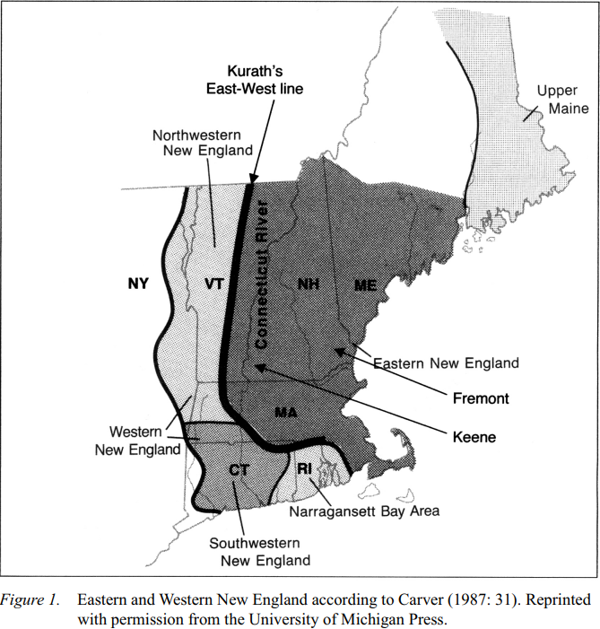 WNE was settled by migration from central MA and central and western CT, including Hartford, Springfield, and New Haven, towns originally settled in the 1630s (Boberg 2001: 4). Following this movement, Eastern and Western NE remained isolated from each other until the early 18th century (Rosenberry 1962: facing 70; Kurath 1972: 42, cited in Boberg 2001: 4). Western VT was settled in the late 18th century by English-speaking migrants from western CT and MA (Kurath 1939-43: 104, cited in Boberg 2001: 5) and from NY (Rosenberry 1962: 136, cited in Boberg 2001: 5), as well as some settlers from east of the Green Mountains (NH, ME, and RI) (Kurath 1939-43: 103-4, cited in Boberg 2001: 5). WNE, in turn, was “the staging ground for the initial English-speaking settlement of the Inland North” (Boberg 2001: 9).