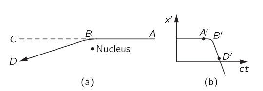 Fig. 34–9. A fast electron passing near a nucleus radiates energy in the direction of its motion.