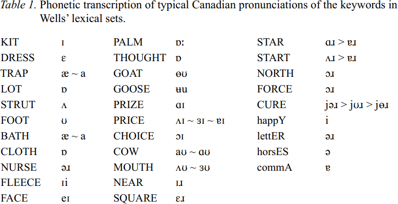 A general view of the phonetic quality of Canadian English vowels can be obtained from Table 1, which gives an approximate phonetic transcription of each of the keywords used to represent Wells’ lexical sets. These transcriptions are necessarily approximate, because small degrees of regional, social, and inter-speaker variation do of course exist, even in the largely homogeneous context described above. With this limitation, they can be taken to represent the general character of the vowels of Standard Canadian English. A more detailed view of the most distinctive aspects of Canadian pronunciation is given below.