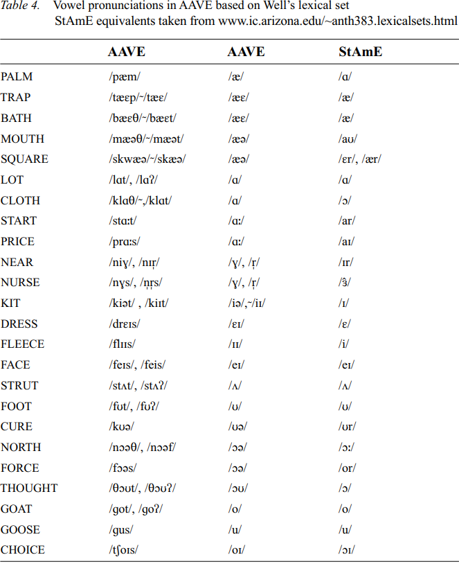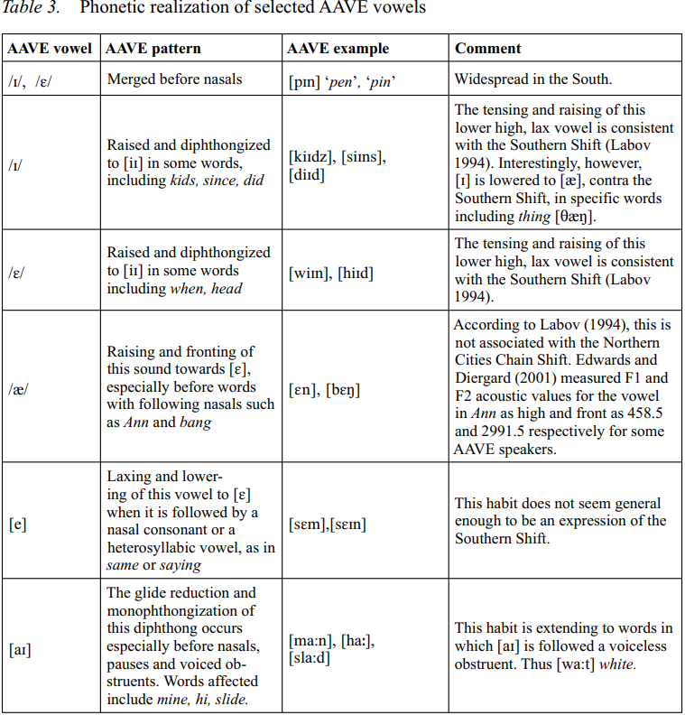 The vowel system of AAVE differs from other American English varieties in several ways, although it does share some of its features with Southern white varieties. In table 3 we display and comment on some of the more frequently noted AAVE variations from StAmE.