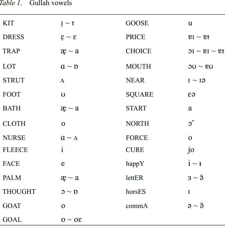 Table 1 summarizes some of the phonetic realizations of Gullah vowels. In each case, the first symbol or set of symbols represents the pronunciations provided by the speaker recorded for this project—an elderly African-American female basket maker from Mount Pleasant, South Carolina. Additional symbols summarize observations made by Turner (1971, 2002) with regard to these sounds. Since some changes are likely to have taken place in the Gullah sound system since Turner’s fieldwork was conducted, any apparent differences in Turner’s observations and those made with regard to the current data set are noted in the text. It should also be noted that none of these sounds have been acoustically measured.