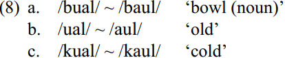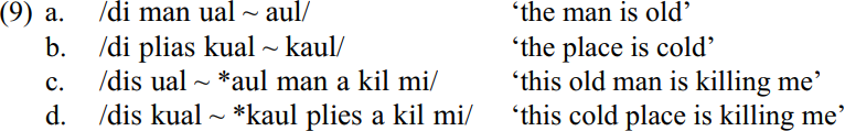 This variation, however, seems restricted to these and perhaps one or two other lexical items. For some speakers, in particular educated bilinguals, the choice of the variant employing /au/ in these items is intended to signal an extreme or intensive meaning, i.e. /aul/ ‘extremely old’, /kaul/ ‘extremely cold’. This may be a result of the fact that the /au/ version is an unusual reflex for JamE /oo/. This deviation from the expected is interpreted to signal, at least for the bilinguals, a deeper and more extreme meaning than the regular JamC /ua/ reflex would signal. In the case of the attributives meaning ‘old’ and ‘cold’, the /au/ alternant is only possible when the item is used as a predicator. When performing an adjective type function within a noun phrase, the /au/ alternant is not possible in JamC. This is demonstrated in the following example.