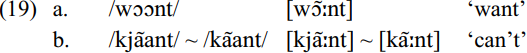 JamE does not allow the variable deletion of a nasal consonant, leaving nasalization of the preceding vowel as the only evidence of its presence underlyingly. Thus, JamE [sõm] ‘some’, unlike its JamC cognate, can never be realized as * [sõ] ‘some’. In addition, the attested role of phonemic vowel nasalization JamC is absent in JamE. In JamC, there are items lexically specified to have a nasalized vowel with no following nasal consonant. In JamE, no such items exist. Below are the JamE cognates of the JamC items with lexically specified nasalized vowels. As can be seen, they both occur in JamE with an /nt/ sequence in the coda.