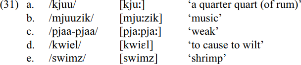 In JamC, the onset may have a maximum of two consonants. In such combinations, the first item is always an obstruent and the second an approximant. Combinations with /w/ as the second consonant are /pw, bw, tw, dw, kw, w, sw/. Those involving /j/ include /pj, bj, tj, dj, kj, j, fj, vj, sj, mj, nj/. Of these, /tj/, /dj/ and /sj/ do not have transparent realizations at the surface level. The matching phonetic forms, *[tj], *[dj] and *[sj] are blocked, in spite of a contrary suggestion by Wells (1973: 21). They may be blocked because the underlying phoneme sequences /tj/ /dj/ and /sj/ have their surface phonetic manifestations merged by speakers with those of the affricate and fricative consonant phonemes, /ʧ/ , /ʤ/ and /ʃ/ . Both sets of sequences become realized phonetically as [ʧ] , [ʤ] and [ʃ] respectively. The fact is, however, that the consonants /ʧ/ , /ʤ/ and /ʃ/ also occur in the coda, e.g. /matʃ/ ‘match’, /ʤoʤ/ ‘judge’, /jjaʃ/ ‘cash’. This establishes that [ʧ] , [ʤ] and [ʃ] can and do represent the consonant phonemes /ʧ/ , /ʤ/ and /ʃ/ rather than just underlying /tj/, /dj/ and /sj/. We suggest nevertheless that in the onset, speakers do treat [ʧ] , [ʤ] and [ʃ] as representing a merger at the phonetic level between [ʧ] , [ʤ] and [ʃ] , on one hand, and /tj/, /dj/ and /sj/ on the other.