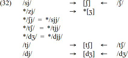 The only consonants occurring in the JamC onset which are blocked from occurring before /j/ are /l/, /r/, /z/, /ʃ/ , /ʧ/ and /ʤ/. Given the position of /l/ and /r/ in the sonority hierarchy, we may regard them as sonorant consonants which, like /j/ and /w/, only occur in second position in the onset. An onset */zj/ cluster fails to occur because it cannot be phonetically reinterpreted. The expected form, * /Ʒ/, does not exist as a phoneme in JamC. The blocking of */ʃj/ , */tʃj/ * /ʤj/and are, we would suggest, the result of the unacceptability of the alternative /sjj/, /tjj/ and /djj/ underlying representation. These would require a */jj/ sequence. The analysis is presented below.
