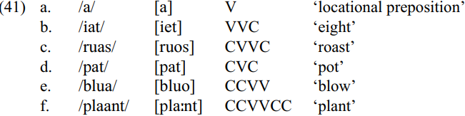 Some of the syllable types that can be derived from the structure above are exemplified in (41) below.