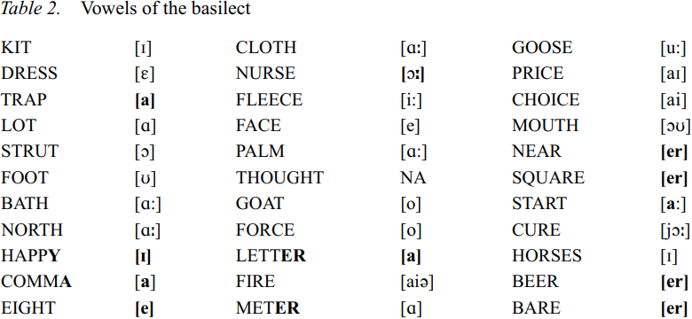 There are two single vowels in all varieties that seem to be reduced monophthongal versions of English diphthongs: [e:]/[e] (<[ei]), and [o:] (< [əʊ] ). BrE /æ/ is lowered to /a/.