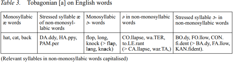[a] is the most frequently occurring Tobagonian vowel. It is used in a vast number of words where the vowel sounds [æ], [ə] , and [ɒ] would be used in British English.
