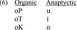 It is fairly clear that there must have been a Proto-Suriname-Creole vowel phoneme /*Λ/ which could be responsible for these /o, ɔ/-reflexes. We claim this because of the usual distribution of the anaptyctic vowels, which is different from other items with mid rounded organic vowels: