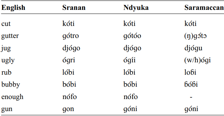 STRUT words with ME /ǔ/ which developed to EModE /Λ/ are represented in Suriname creoles by English words like cut, jug, run, love, rub, money, enough, country, etc. The main realization of this set of words is with /o, ɔ/.