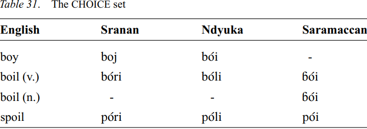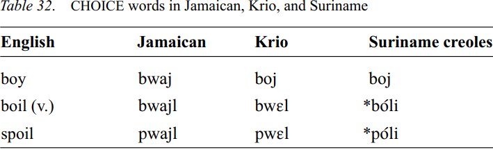 The CHOICE set of words, corresponding to ME /ɔi, ʊi/ , is represented in Suriname creoles by words derived from Early Modern English boy, boil (n.), boil (v.), and spoil. According to Dobson (1957) the /ɔi/ found in modern Standard English is derived from one ME variant, alternating in many words with /ʊi/ which later became /ai/ (< /´i/) in advanced pronunciation in EModE.