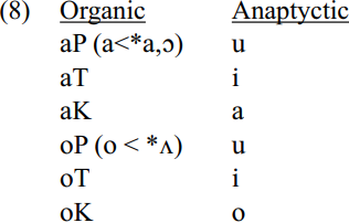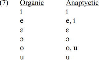 Let us start from the anaptyctic vowel /-i/. This implies in general a front organic vowel. We ignore the fact that coronal consonants following organic historic low vowels trigger anaptyctic /-i/ because we expect the three English diphthongs to be treated in a parallel fashion. As Smith (1987: 432) observes “The only case that would fit the occurring patterns would be a model involving the EModE vowel /Λ/ followed by an alveolar”. Why /ɔi/ should result in /Λ/ is not at all clear. It is of course the case that the CHOICE set has fallen together with the STRUT set.