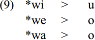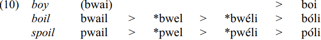 Here, however, the diphthong /ɔi/ gives us /o-i/. The other two diphthongs in English /ai/ and /au/ result in /e-i, e-e/ and /o-u, o-o/ respectively. In other words diphthongs are generally compressed to single vowels, of forecastable quality. /e/ reflects the features of both /a/ and /i – low] and [front], and /o/ the features of both /a/ and /u – low] and [round]. But, the /o/ in /bo’ri/ does not reflect both the features of /ɔ/ and the features of /i/. We must look further.